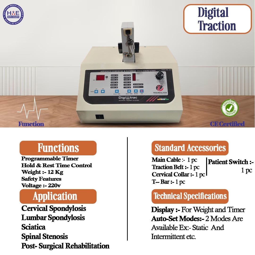 Advanced digital traction unit for cervical & lumbar therapy with precise force control and multiple treatment modes. The Digital Traction Machine is a modern electro-mechanical traction system designed for spinal decompression therapy. It provides controlled cervical and lumbar traction to reduce nerve compression, relieve disc pressure, and ease muscle spasms. With a fully digital display, adjustable force settings, timer control, and auto/hold/intermittent modes, this unit ensures safe and effective physiotherapy sessions. Ideal for physiotherapy centers, ortho clinics, and rehabilitation facilities. 🔧 Key Features: Digital display for traction force & timer Auto / Manual / Intermittent modes Smooth & silent motor operation Adjustable traction force Heavy-duty frame with comfortable belts Cervical and lumbar traction capability Overload protection for patient safety User-friendly control panel ⚙️ Specifications: Type: Cervical & Lumbar Traction Display: Digital Operation Modes: Auto / Manual / Intermittent Traction Force: Adjustable Timer: 0–99 minutes Power Source: AC Body Material: Metal + ABS Application: Spine therapy, decompression, disc pain 🎯 Applications: Cervical & lumbar spondylosis Disc bulge / herniated disc Sciatica Muscle spasm reduction Spinal decompression therapy Nerve compression relief