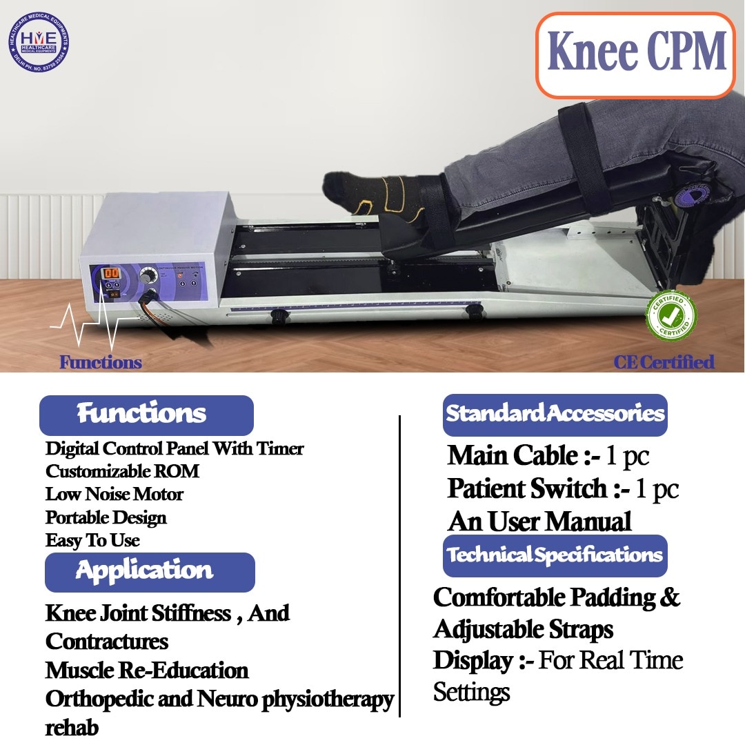 Manual CPM device for controlled knee mobilization and rehabilitation. The Manual CPM Machine is designed for passive movement therapy of the knee joint. It helps increase range of motion, reduce stiffness, and support recovery after surgery or injury. The manual mechanism allows smooth, controlled movement without electricity—ideal for physiotherapy clinics, ortho centres, and home rehab. Features: Manual operation—no electricity required Smooth knee flexion & extension movement Adjustable ROM settings Heavy-duty metal frame Comfortable leg support pads Easy-to-use hand control lever Applications: Post knee surgery (TKR / ACL / PCL) Joint stiffness Knee mobilisation therapy Ortho rehabilitation Physiotherapy clinics & home rehab