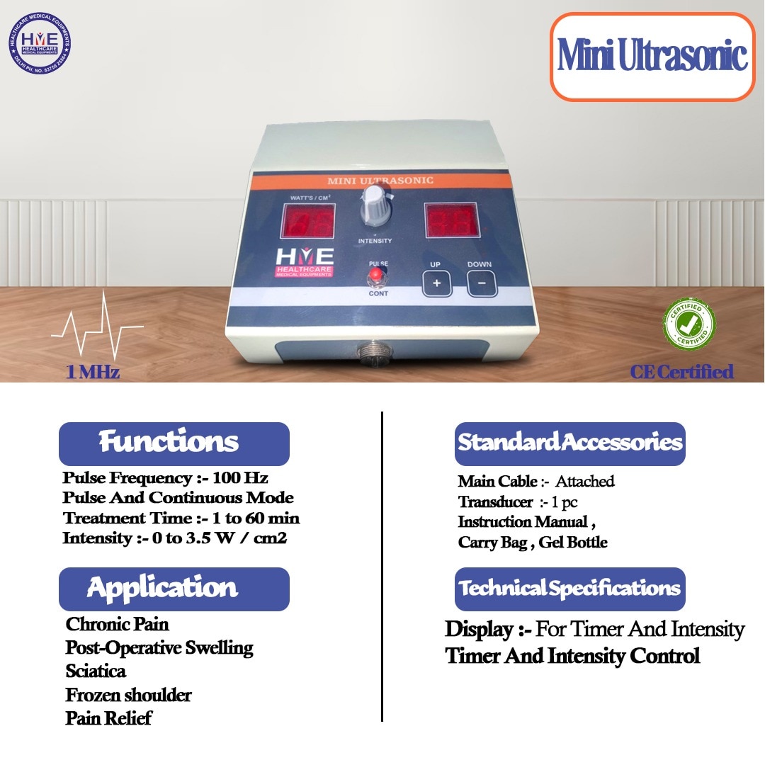 Compact and effective Mini Ultrasonic Machine for pain relief, muscle relaxation, and therapy – ideal for home use and clinics. 📝 Full Description: The Mini Ultrasonic Therapy Machine is a small, portable device used in physiotherapy for pain management, muscle relaxation, and tissue healing. It delivers ultrasound waves deep into the tissues to promote blood circulation, reduce swelling, and aid recovery. This compact model is easy to carry, operate, and maintain. Suitable for home therapy, clinics, and rehab centers, it is commonly used to treat joint pain, soft tissue injuries, back pain, and arthritis. 🔧 Key Features: Compact & portable design Frequency: 1 MHz (Standard therapeutic frequency) Easy operation – plug and use Lightweight and travel-friendly Effective for muscle pain, joint stiffness, and inflammation ABS body for durability ⚙️ Specifications: Frequency: 1 MHz Power Source: AC Timer: 0–30 minutes Intensity: Adjustable Body Type: ABS Weight: Approx. 1 kg Application Areas: Back, Neck, Joints, Arms, Legs 🎯 Applications: Relief from muscle pain and stiffness Swelling and inflammation reduction Improved blood circulation Treatment for arthritis, sciatica, tendonitis Home and clinical rehabilitation therapy